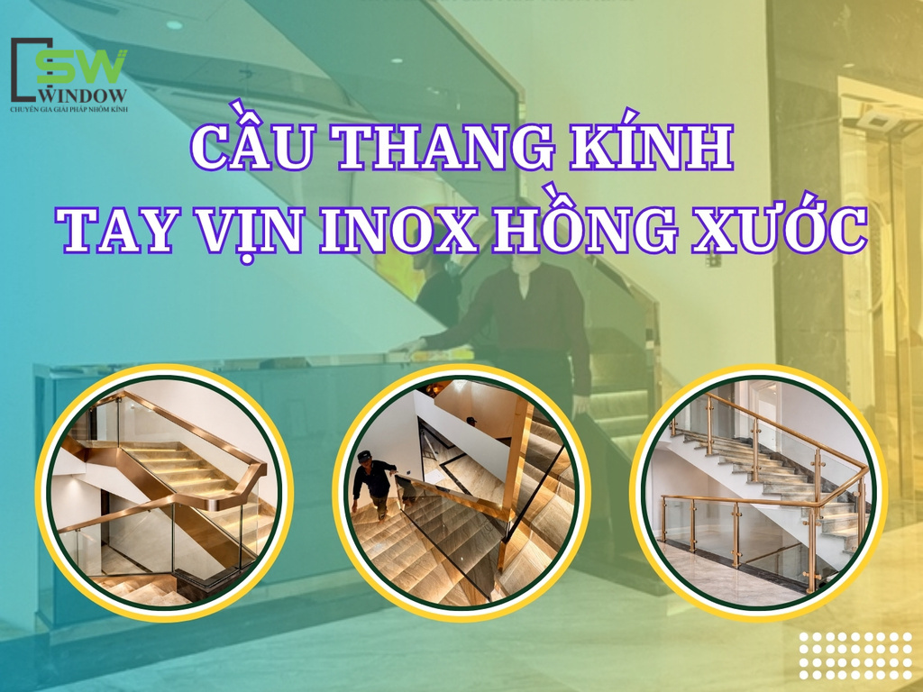 Cầu thang kính tay vịn Inox màu hồng xước của SW WINDOW