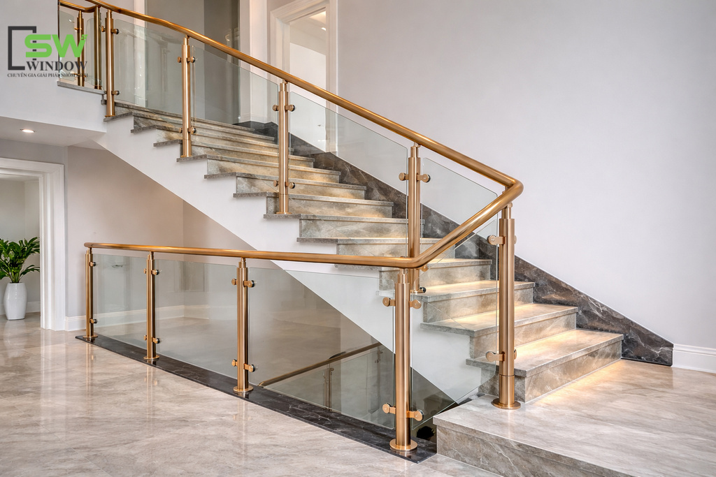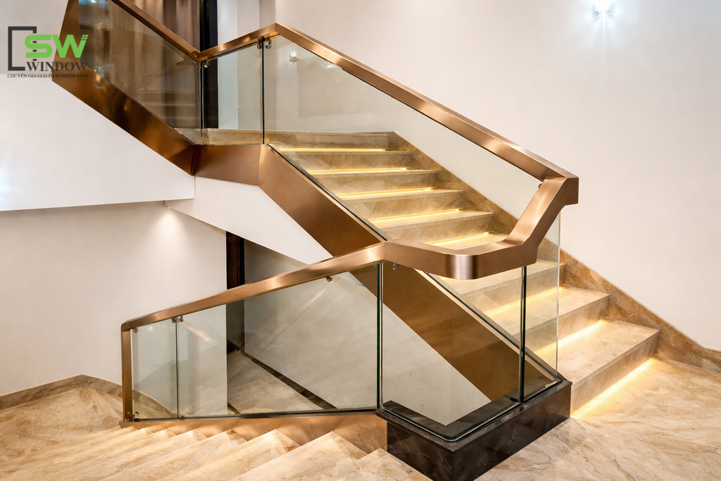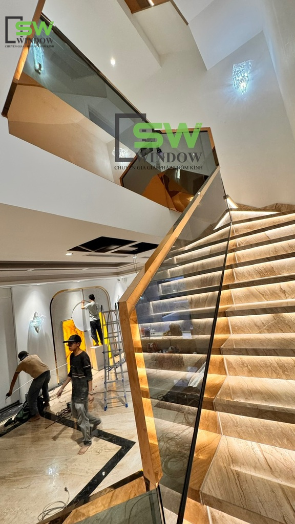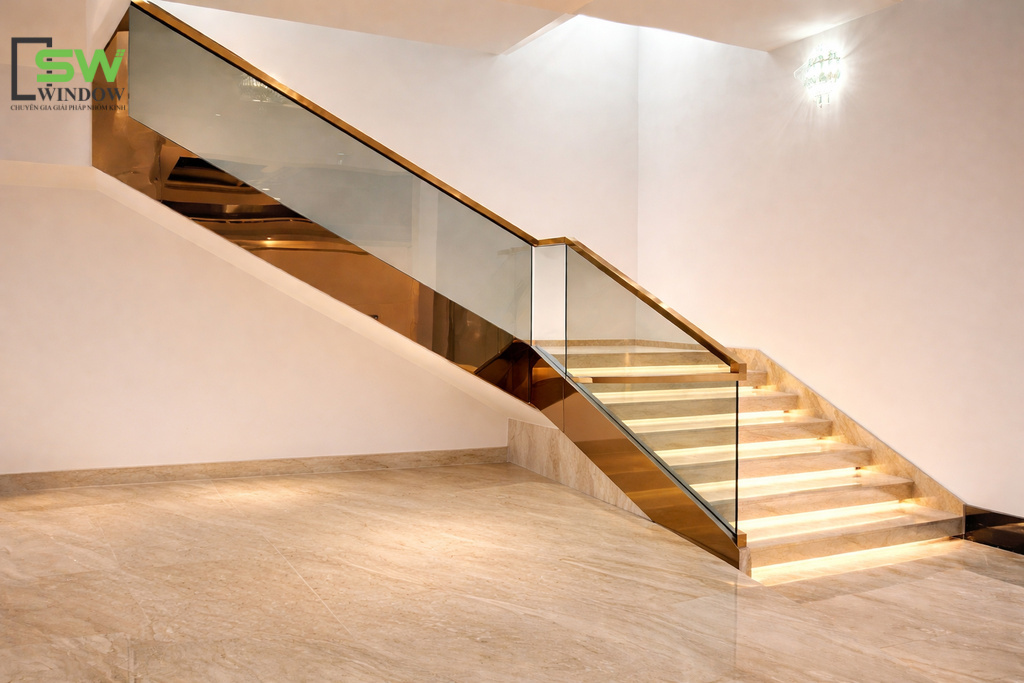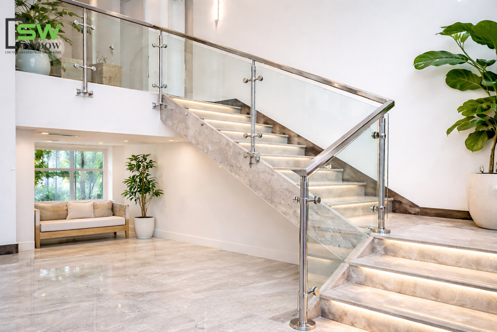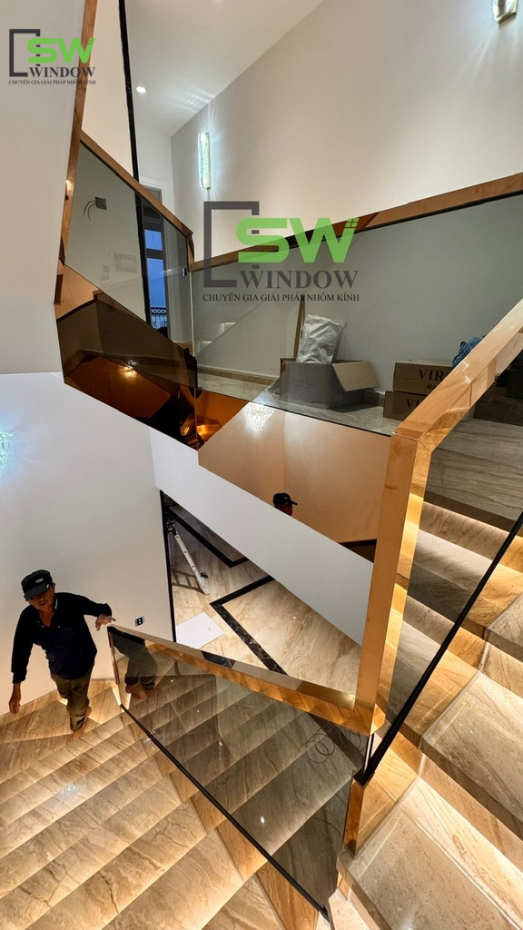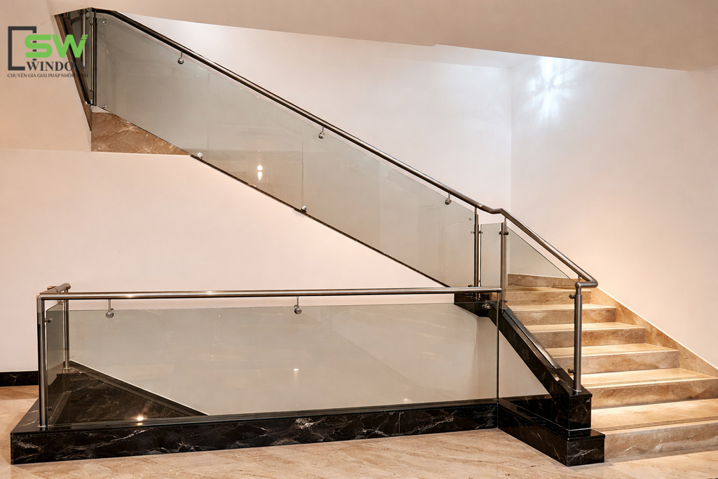 Cầu thang kính tay vịn Inox đang là xu hướng thiết kế nội thất hiện đại cho nhà phố, biệt thự, showroom, văn phòng,... Tại Công Ty TNHH SX – TM DV SW WINDOW, chúng tôi không chỉ xây dựng cầu thang, chúng tôi kiến tạo những "điểm chạm" thẩm mỹ cho ngôi nhà của bạn.