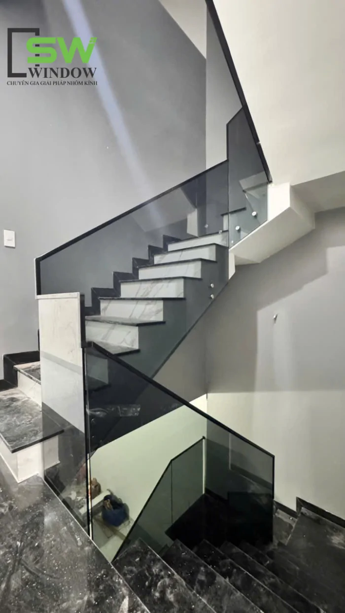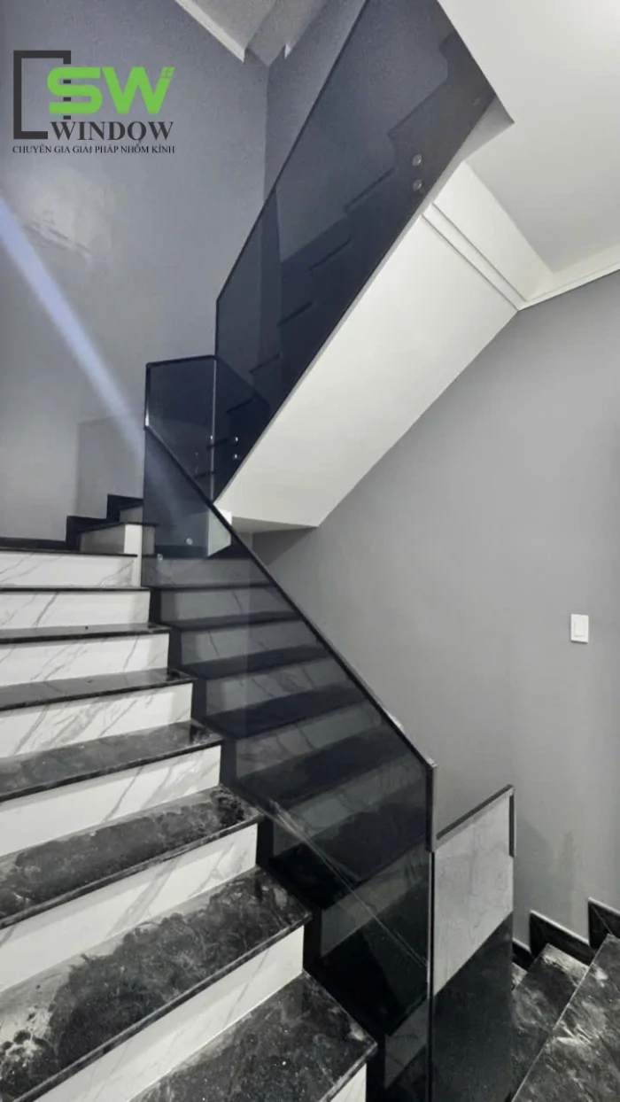 SW WINDOW cam kết mang đến cầu thang kính xám khói cục sạc tay vịn nhôm đạt chuẩn đẹp – bền – an toàn, đúng như bản vẽ và mong muốn của khách hàng.