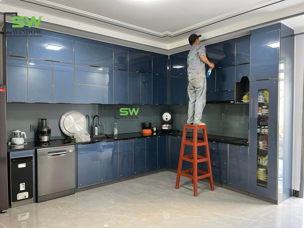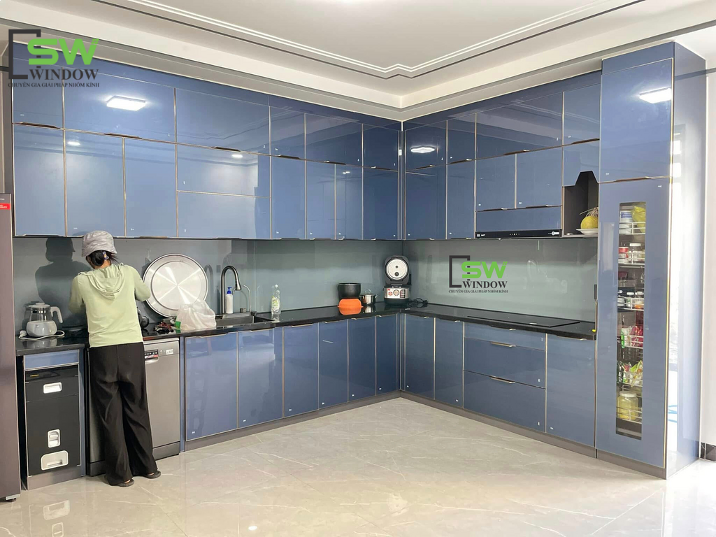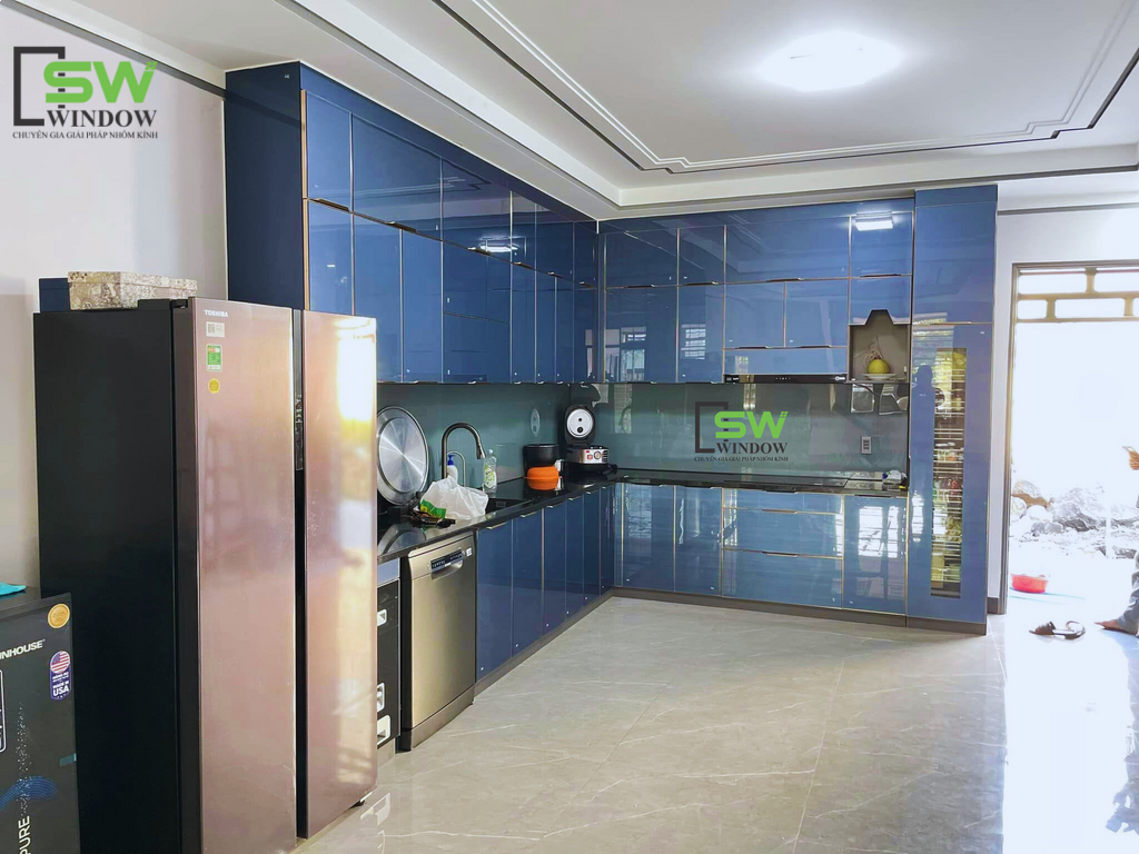 Tủ bếp nhôm cánh kính full trần là hệ tủ được thiết kế kịch trần, sử dụng: