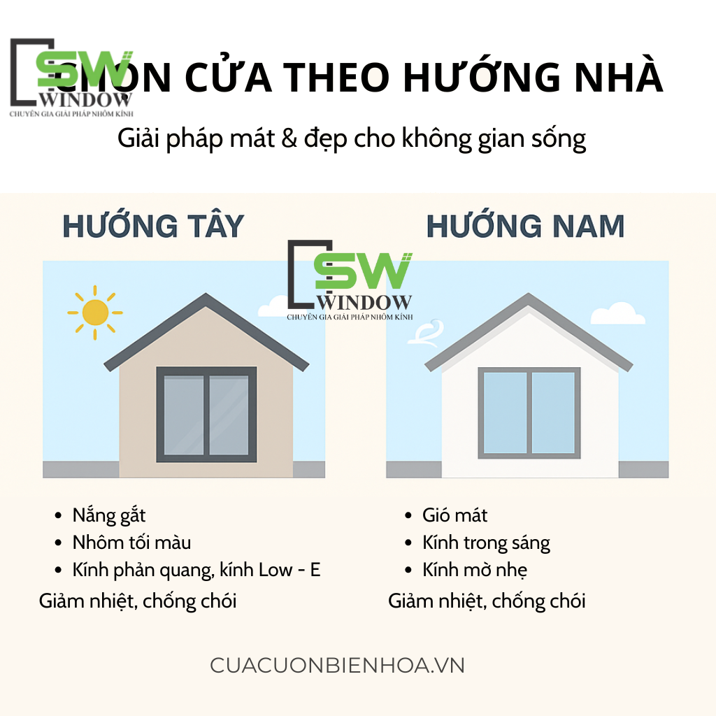 Chọn cửa nhôm kính đúng hướng giúp ngôi nhà mát hơn, tiết kiệm điện và bền đẹp theo thời gian. SW Window chia sẻ bí quyết chọn cửa cho nhà hướng Tây, hướng Nam chuẩn phong thủy & công năng.